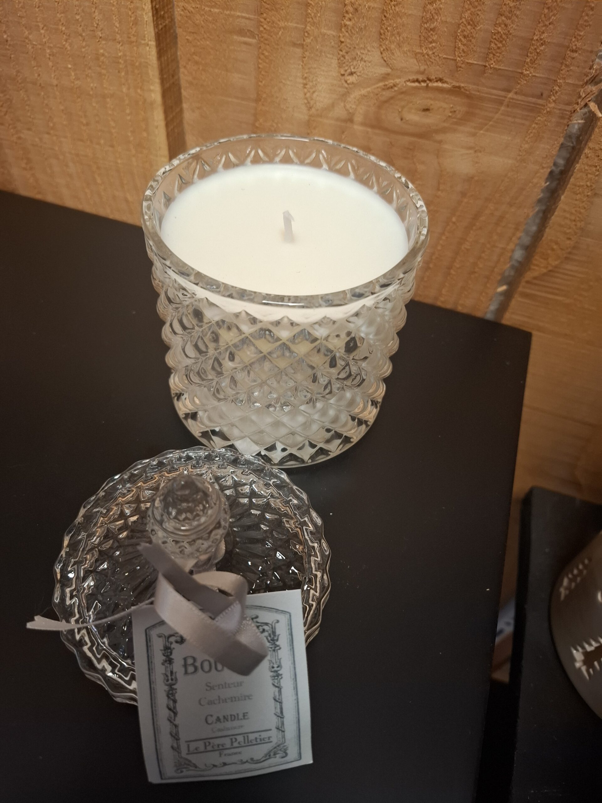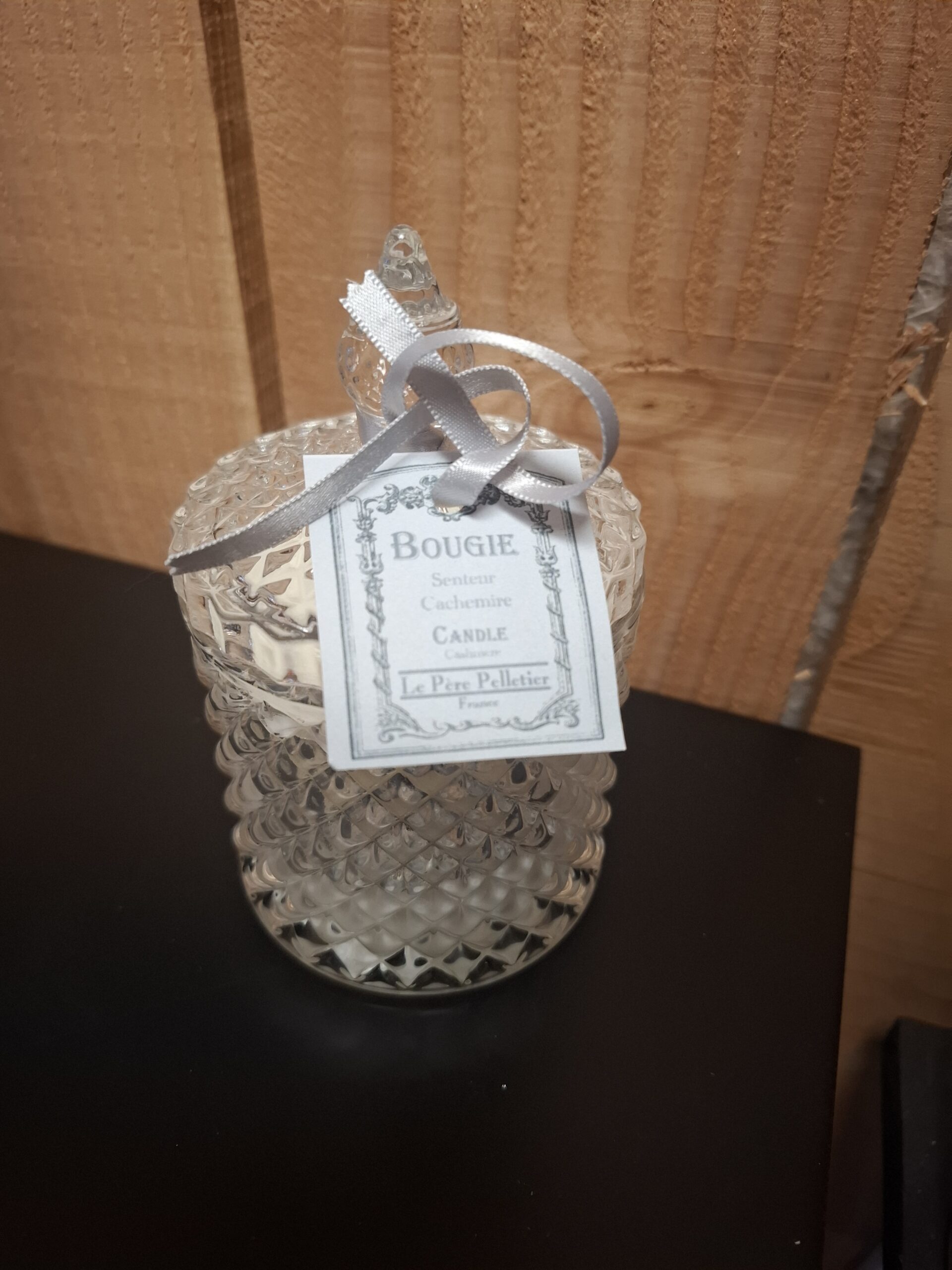 La bonbonnière en verre qui abrite la bougie ajoute une touche de raffinement à votre intérieur.