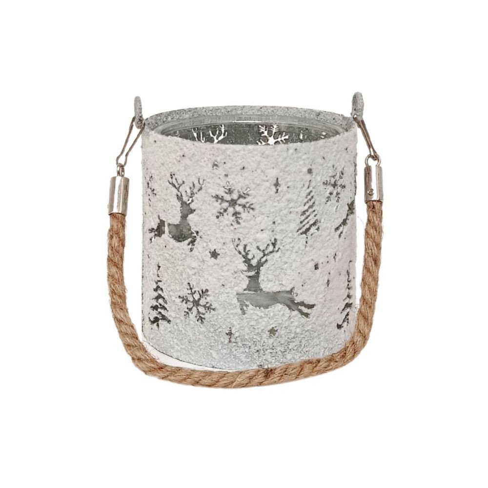 Photophore rond en métal enneigé « Rennes de Noël » Ø.12,5 x Ht.12 cm